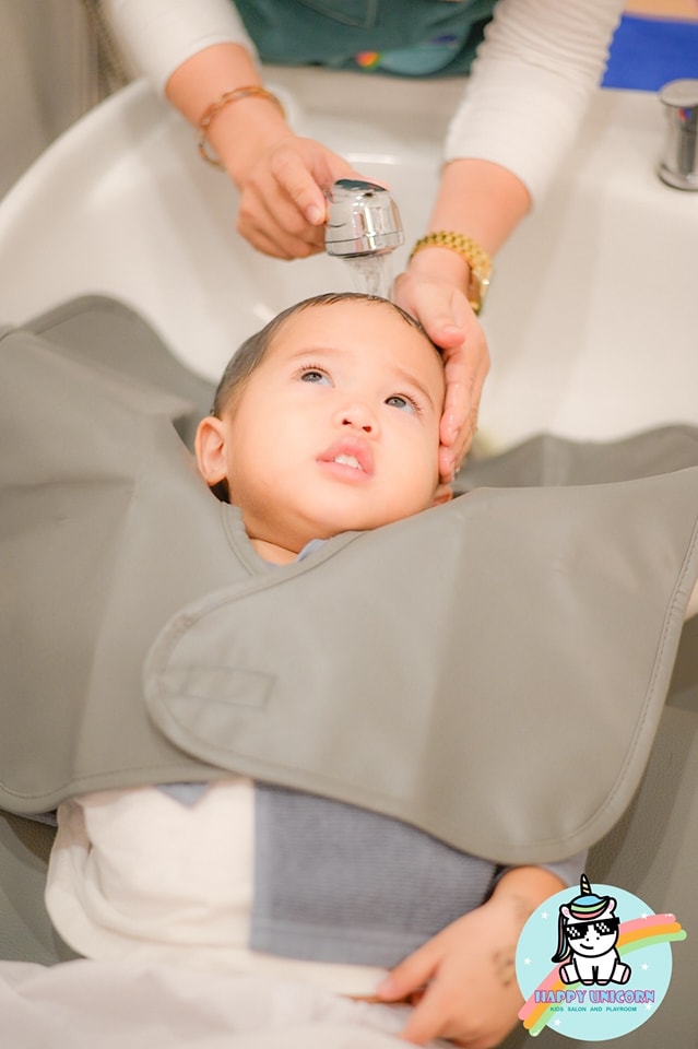 Relax and refresh with gentle shampoo and blowdry — perfect for parents while kids enjoy their playtime.